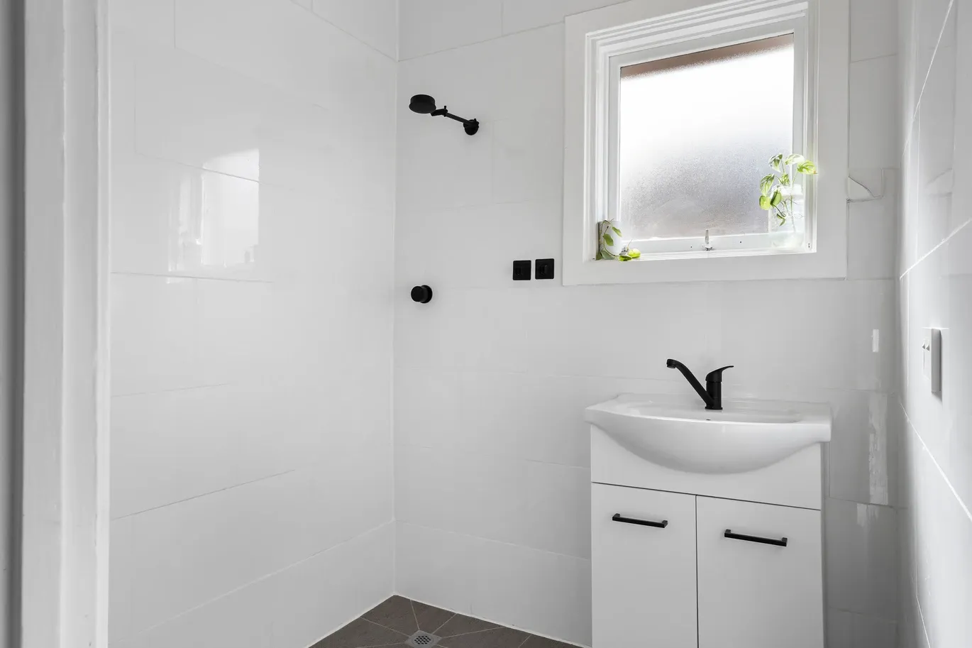 - Updated bathroom with an open shower, vanity storage, floor-to-ceiling tiles, and a separate toilet in the laundry room