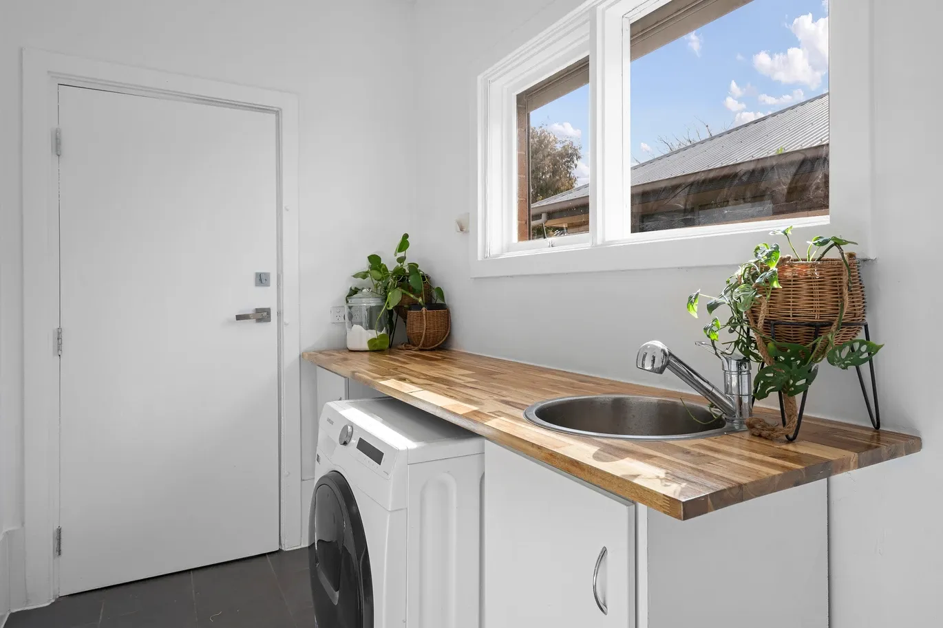 - Upgraded laundry room with timber countertops and storage space, with outdoor access