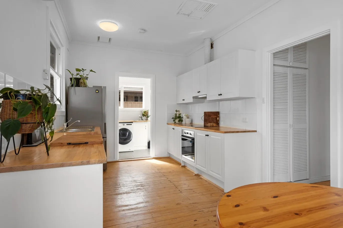 - The upgraded kitchen has a built-in electric stove, timber countertops, and ample white cabinetry