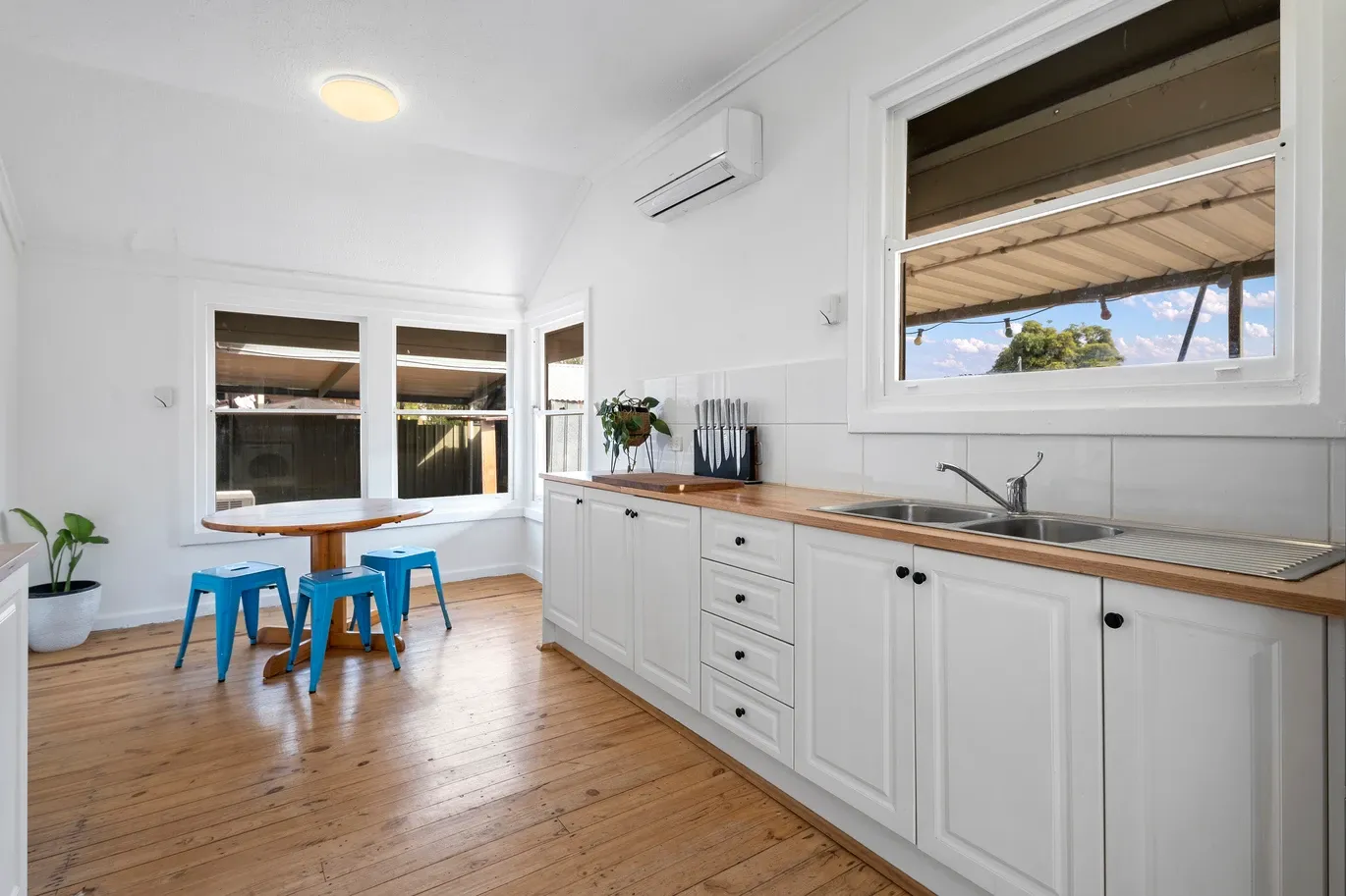 - Split system air conditioning in the lounge room, kitchen, and third bed